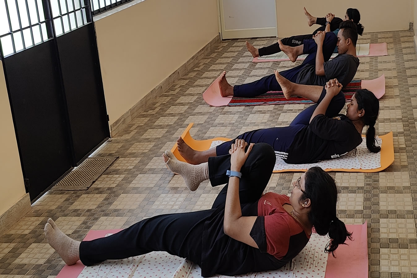 It includes Breathing,joint movements,breathing with joint movements, yoga, pranayama, yoga nidra and relaxation technique.